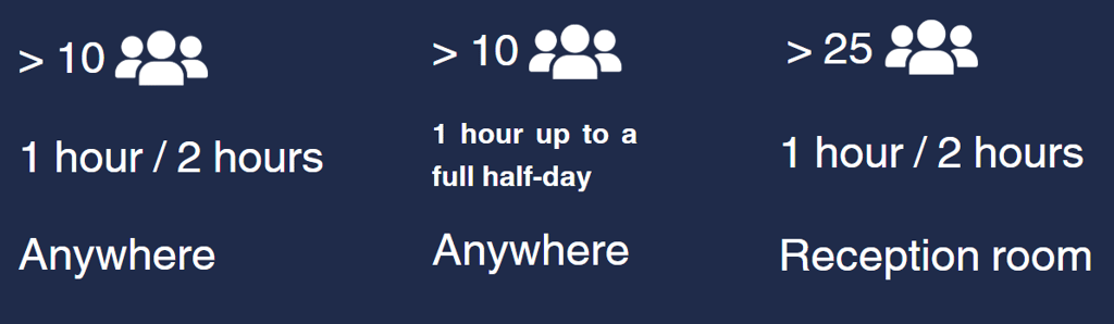 Choose from flexible durations (1, 2, or 3 hours) and fully adaptable locations—conference rooms, rooms, entire structures, bars, and more.